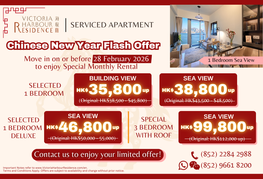 (a) "Victoria Harbour Residence (海璇匯)" is the name given to Tower 6 ("Tower 6") of Phase 1B of Victoria Harbour Development ("the Development") for promotion of the letting of the residential units in Tower 6 as serviced apartments. The name is a name used for marketing of the serviced apartments and will not appear in the Deed of Mutual Covenant or any other title deeds and documents of the Development, save that the name may appear in tenancy and licence related documents of the serviced apartments. (b) Choice Win (H.K.) Limited reserves the right to vary, suspend or terminate the serviced apartments arrangement at any time without prior notice. (c) This promotional material is not an advertisement for promoting, and does not purport to promote, the sale of any of the residential units in Tower 6 or any other residential property of the Development. (d) This promotional material does not constitute and must not be construed as any offer or representation, whether express or implied, on the part of Choice Win (H.K.)Limited in relation to the sale, or promotion for the sale, of any residential units in Tower 6 or any other residential property of the Development, and shall not be relied on by any person as such. (e) The photos may have been edited and/or processed with computerized imaging techniques and are not taken from Victoria Harbour Residence. They do not illustrate the actual view from any part of Victoria Harbour Residence. All information, statements and specifications contained in this promotional material are for reference purposes only and shall not form any part of any offer or contract. (f) Choice Win (H.K.) Limited reserves its absolute right to amend or change any parts and any of the facilities of the clubhouse and landscaped garden without any prior notice. The facilities of the clubhouse, landscaped garden and/or recreational facilities and the dates of completion thereof are subject to final approval by the Buildings Department, Lands Department and/or other relevant government authorities. The clubhouse, landscaped garden and/or recreational facilities may not be available for immediate use at the time of move in of the residential properties of Phase 1B of the Development. Moreover, some clubhouse facilities (i.e. Vici Gala, Queen's Pool, Arodagio Spa, Chill Yoga and a part of Harbour-V Fitness) belong to subsequent phase(s) of the Development, which can only be open for use after the completion of the said subsequent phase(s) and upon the satisfaction of all requisite requirements. The use or operation of some of the facilities and/or services may be subject to the consent or permit issued by relevant government departments, or may require additional payments. Names of different areas and facilities of the clubhouse are promotional names used in promotional materials only. Such names will not appear in the deed of mutual covenant, the preliminary agreement for sale and purchase, agreement for sale and purchase, assignment, or any other title deeds or documents.